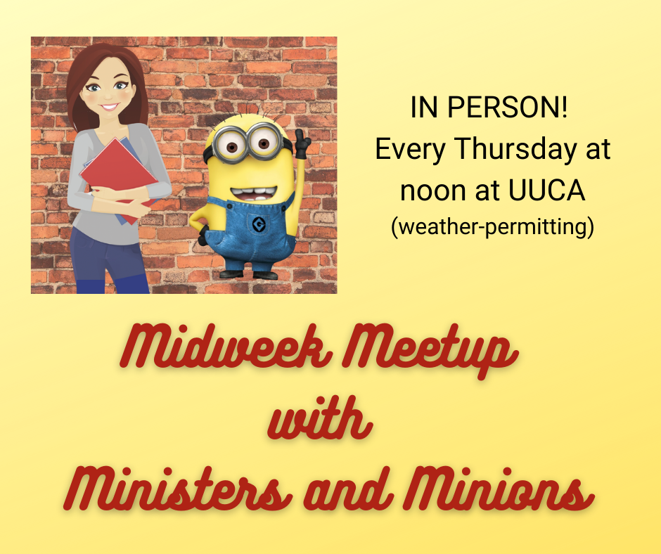 One of the ministers, a UUCA Board Member, Linda Topp, or Venny Zachritz will be loitering on the Sandburg Hall deck every Thursday at noon, just waiting to talk to someone. Bring a chair, your lunch if you’d like, and sit a spell and chat. (Weather-permitting so it’s not likely we’ll meet on rainy days or those days below 40 degrees!) However, if you really want to talk with someone, feel free to contact Rev. Mark and he’ll set up something for you.