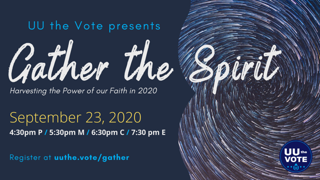 Join us for the last UU the Vote virtual mobilization before Election Day. At our Gather the Spirit event, on Wednesday, September 23rd at 7:30 ET / 4:30 PT we are unlocking the full power of our community and our values to go All In during the UU the Vote Fall push.