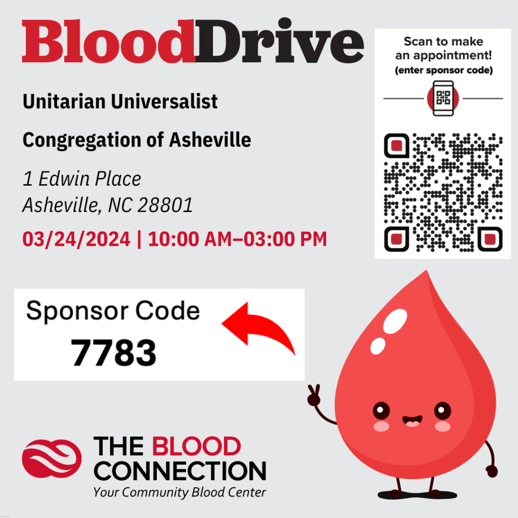 The post UU Avl is sponsoring a Blood Drive! appeared first on Unitarian Universalist Congregation of Asheville.